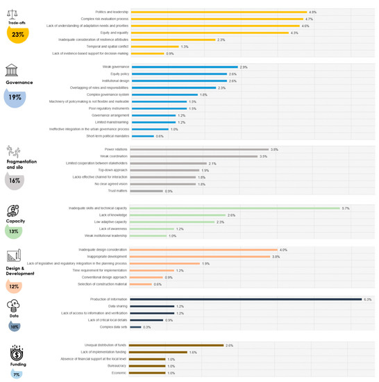 Forty-six issues and challenges were identified under these seven key themes, as illustrated in Figure 3. This study’s analysis shows that the production of information (6.3%) is one of the greatest challenges faced in this area. Issues associated with information have been highlighted as the major cause that undermines effective decision-making processes. The second-highest challenge is the inadequate skills and technical capacity (5.7%) of the relevant stakeholders (such as local level institutions that impede efforts to reduce disaster and climate risk). Several key challenges were found under the trade-offs theme, such as politics and leadership (4.8%), a complex risk evaluation process (4.7%), a lack of understanding of adaptation needs and priorities (4.6%), and equity and equality (4.3%). The review indicates that issues, such as inadequate design consideration (4.0%), power relations and inappropriate development (3.8%), weak coordination (3.5%), and weak governance (2.9%), are also disrupting the implementation of risk-sensitive urban design.