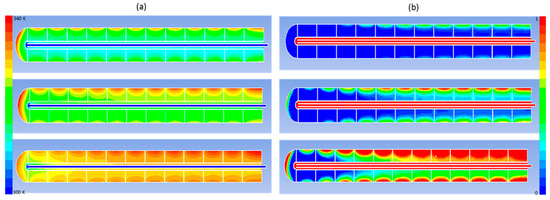 Figure 5 shows the HTF temperature for the four cases and Figure 6 shows the variation of the PCM melted fraction for the studied cases. The average melted PCM fraction is faster when the heat transfer enhancement method is used in the cases (3) and (4), as shown. Using case (1) as the basis, the melting rate is slightly faster by adding the plate fins in the PCM case (2), which indicates that the plate fins have reduced the PCM’s thermal resistance. Besides that, in comparison to case (1), the addition of copper foam (i.e., case (3)) improves heat transfer because more heat can be extracted from the PCM and transferred to the HTF via volumetric heat exchange in the foam structure. However, when the fins are added with the copper foam (i.e., case (4)), there is no discernible difference in the rate of heat transfer. This can be explained by the fact that when the copper foam is inserted, the heat transfer rate reaches its maximum due to the HTF’s thermal resistance. Thus, inserting copper foam is sufficient, and there is no need to add fins with copper foam.