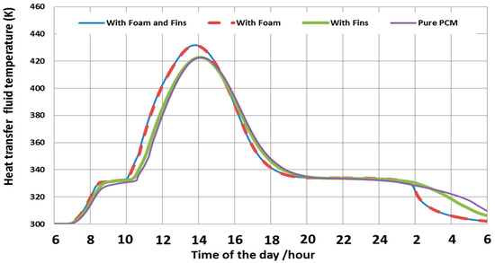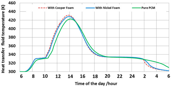 In order to understand the effect of the integration of metal foam inside the ETSC/PCM system, two types of base material, copper and nickel, are tested. Figure 7 shows the variation of the HTF temperature for pure PCM case and for the two cases of metal foams (i.e., copper and nickel).