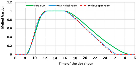 Figure 7 shows that the metal foam manufactured from copper yields a higher HTF temperature of 430 K compared those of pure PCM, and nickel foam were 421 K and 425 K, respectively. This is because the thermal conductivity of a PCM/nickel foam composite is nearly three times that of pure PCM, while the thermal conductivity of a PCM/copper foam composite is nearly 15 times that of pure PCM. Figure 8 shows that with metal foam manufactured from copper, the melting and freezing processes are faster than other cases.