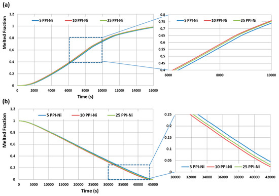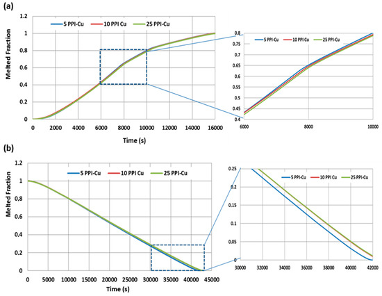 - The melting/freezing processes are slightly faster, with 5 PPI copper foam and 10 PPI nickel foam pore sizes, which correspond to the lower latent heat capacity and lower amount of PCM.