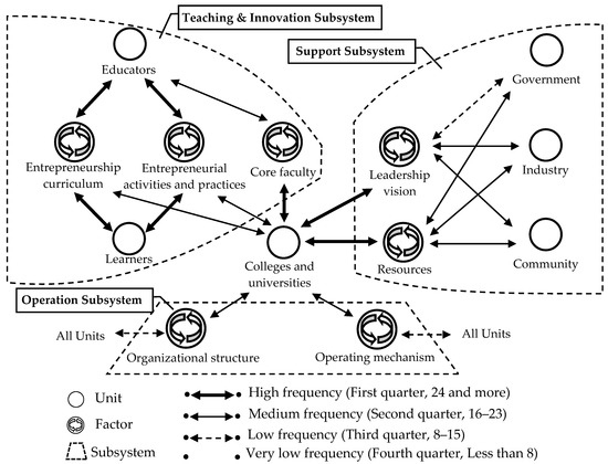 To further clarify the relations among the key elements that make up the entrepreneurship education ecosystem, Figure 2 graphically presents the relationship nodes identified from the analysis of the roles and their importance along with the key elements. In the figure, the units and factors are depicted by two types of circles that are connected by arrows of different thicknesses according to the frequency of the secondary relationship nodes. The frequency values were calculated as the number of coded relationship nodes used to describe the relations among the elements in the interview text. The relations between any two elements had a maximum frequency of 31 and a minimum frequency of 0, and the frequencies were categorized into four levels from “Very Low” to “High”, respectively represented by different types of arrows in Figure 2. The identified units and factors are grouped into three areas as the teaching and innovation, support, and operation subsystem based on their roles in the entrepreneurship education ecosystem, and the colleges and universities interconnect these main areas.
