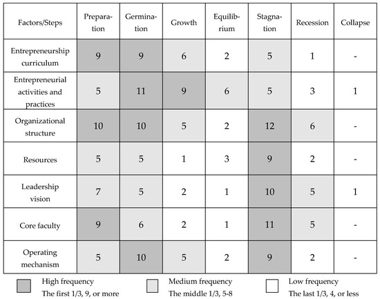 Ignoring the sudden changes to the ecosystem caused by extreme external forces, such as university mergers or natural disasters, the entrepreneurship education ecosystems are all in one of the seven steps of the development cycle found in this study. These seven steps were divided based on the characteristics and the relationships of the elements in the ecosystem. From a dialectical perspective, the elements of the entrepreneurship education ecosystem may play different roles and have varying importance in the seven steps of the development cycle. The role and importance of the unit-type elements are more intuitive (e.g., the role of educators and learners). Compared with the units, understanding the role and importance of the factor elements that link the units together is a more valuable and meaningful study [88]. Although one-third of the interviewees initially responded “equally” to the question about the importance of the factors of the ecosystem, they provided more specific answers while discussing the steps of the development cycle. Then, it was found that when interviewees described or discussed a certain step of the development cycle, some factors of the ecosystem were mentioned frequently. Moreover, the role and importance of certain factors were always associated with a specific step of the development cycle. To explore the role and importance of ecosystem factors in the different steps of the development cycles, this study used the coding tool of NVivo to conduct a cross-analysis of elements coding and development processes coding. The factors part of the secondary node of elements coding and the secondary node of development processes coding were cross-tabulated, as shown in Figure 3.