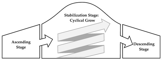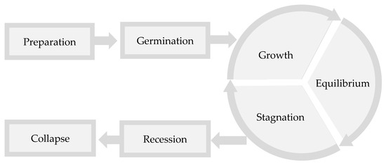 In chronological order, the first stage was the ascending stage, including the two steps of preparation and germination. The second stage was the stabilization stage, including the three steps of growth, equilibrium, and stagnation. The last was the declining stage, including the two steps of recession and collapse. Among them, the two stages of ascending and declining were a one-way development process. However, the three steps of the stabilization stage showed typical cyclic characteristics. Based on these findings, the diagram of development cycles of the entrepreneurship education ecosystem was constructed, as shown in Figure 4.