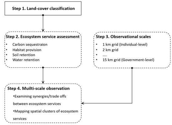 Understanding the impact of observational scale on the interactions and spatial distribution of ecosystem services is an integral part of mainstreaming the incorporation of ecosystem services knowledge into ecosystem management strategies at the science–policy interface [1,2,3]. In ecological studies, observational scale can be defined in several ways depending on the context. For example, in studies based on remote sensing and modeling, observational scale is usually described as having four components: (1) level of spatial detail, (2) numerical fraction, (3) spatial extent, and (4) process scale [4,5,6], which together indicate that ecological phenomena and objects each have their own distinct scale, or a range of scales, at which their characteristics and patterns are best observed [7,8]. An example to clarify the importance of observational scale selection is the competition between individual plants, which can be observed and discussed at the habitat scale but not at the regional or global scale [9,10]. At these larger scales, the break-out of pests or diseases (regional scale) and climate change (global scale) are more suitable topics for observation [11].
