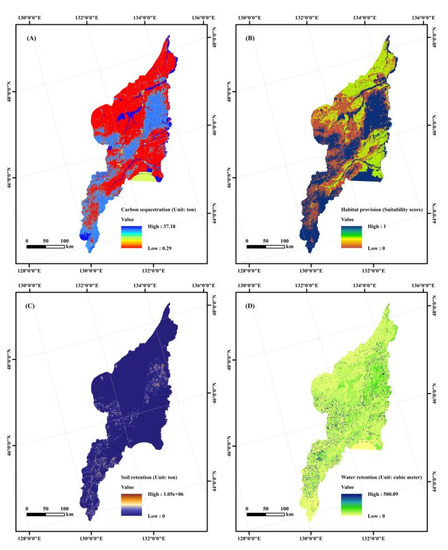 Distribution maps for the four ecosystem services examined in the present study. (A) Carbon sequestration; (B) habitat provision; (C) soil retention; (D) water retention.