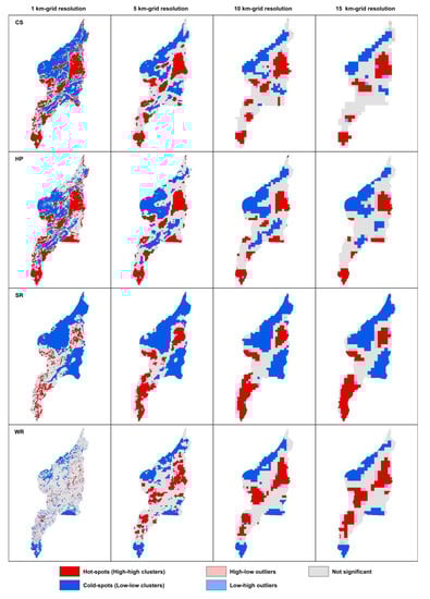 Shifts in whether hot- or cold-spots were dominant were observed for CS, HP, and WR (Figure 5A,B,D). For CS and WR, there was a greater proportion of cold-spots compared with hot-spots at lower grid resolutions, but a greater proportion of hot-spots compared with cold-spots at higher resolutions; this reversal occurred at 10 km grid resolutions for CS and at 8 km grid resolution for WR. For HP, the proportion of hot-spots was greater than that of cold-spots at 1 km grid resolution, but this situation reversed from 2 km grid resolution.