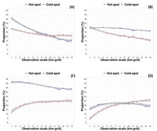 Changes in the proportion of land classified as hot/cold-spots with increasing observational scale for the four ecosystem services. (A) Carbon sequestration. (B) Habitat provision. (C) Soil retention. (D) Water retention. Gray curves are fitted curves that indicate the general trend (95% confidence interval).