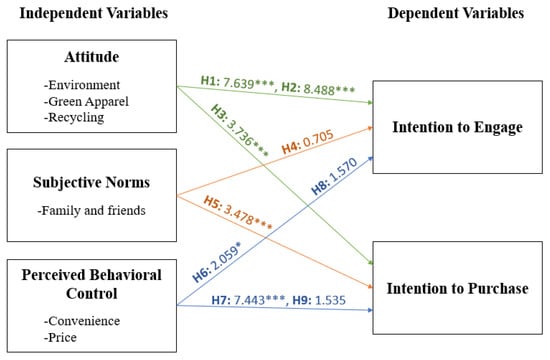 First, testing the independent variables of attitude, subjective norms, and perceived behavioral control on the dependent variable of intention to engage was measured through a regression analysis (Intention to Engage = a + b1 * attitude + b2 * subjective norm + b3 * PBC + e). Coefficients can be found in Table 3. Testing participants’ intention to engage in sustainable behaviors generated many positive results and yielded a variance of 64.8% (R² = 0.648, F (5, 374) = 140.437, p < 0.001). Participants’ positive attitudes towards recycling items led to a higher intention to engage in sustainable behavior (t = 7.639 ***, p < 0.001). Thus, Hypothesis H1, testing that ‘positive attitudes towards recycling apparel leads to higher intention to engage in sustainable behavior’ was accepted. Similarly, participants’ positive attitudes towards the environment led to a higher intention to engage in sustainable behavior (t = 8.488 ***, p < 0.001). Consequently, Hypothesis H2, testing that ‘positive attitudes towards the environment leads to a higher intention to engage in sustainable behavior’ was also accepted. Participants’ convenience of purchasing green products was also found to have a positive influence on the intention to engage in sustainable behavior (t = 2.059 *, p < 0.05). Therefore, Hypothesis H6, testing that ‘convenience of purchasing green products will have a positive influence on intention to engage in sustainable behavior’ was accepted.