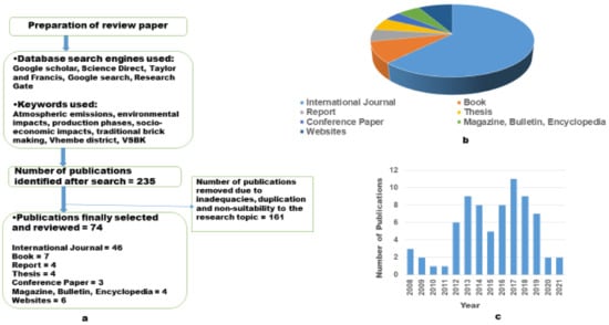 This study explores the use of literature to establish the socioeconomic, health and environmental impact of brick making on the brick workers and the environment. In addition, quantitative data were obtained during a field survey to establish the phases of traditional brick making in Vhembe District of South Africa. For the review, Google Scholar, Research Gate, Science Direct, PubMed, Taylor and Francis and Ebscohost databases were used to search for keywords related to brick making (Figure 2a). Keywords such as traditional brick making, environmental and health impacts of traditional brick making, production phases of traditional brick making, socioeconomic impacts of traditional brick making, atmospheric emissions from brick making and efficiency of Vertical Shaft brick kiln (VSBK) were used during the publication search. The categories of publications used for the review and their proportions are displayed in Figure 2b. Publications made between 1980 and 2021 were harvested and used for the review (Figure 2c).