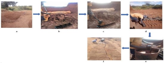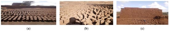 Successive batches of the wet bricks are aligned in a specified order as shown in Figure 4f. After moulding, a handful amount of sand is poured on the wet brick surface to prevent cracking and direct heat from the sun. Sand is sometimes added to achieve the right properties such as reduced drying shrinkage, drying sensitivity and firing range [18]. Twala [16] emphasised the necessity of adding at least 50% of silt and sand to the clay soil.