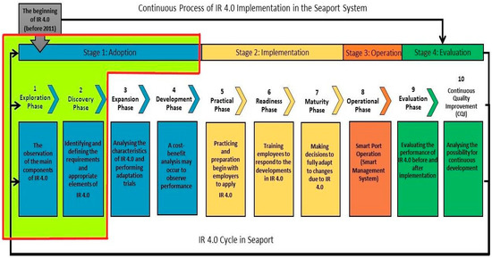 According to Jeevan et al. [18] there are four stages that must be considered for implementing IR 4.0 in the seaport industry: adoption, implementation, operational, and evaluation and has proven that the current IR 4.0 implementation in the global scenario is currently at the stage of adoption at the expanding phase. Figure 2 shows a Malaysian situation where the findings indicate that the current status of IR 4.0 implementation, in this seaport system, is at the stage of adoption, after the exploration phase, and at the beginning of the discovery phase.