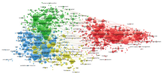 The literature on sustainable HRM is expanding; however, it is still relatively scarce. We analyzed published articles on the topic of sustainable HRM in Web of Science from the year of 1987 to 2021 using the VOS viewer. As a comprehensive analysis of the acquired results would entail a full, detailed article, our intention was only to identify how frequently are our main concepts—as named in our keywords—are presented in research. Ultimately, the results were surprising. Not one of our keywords, apart from “sustainable development” (corporate social responsibility, strategic HRM, sustainable HRM, sustainability reporting and accountability), had connections/relations to other topics and concepts within the published literature in that period. The environmental dimension of sustainable development was the prevailing aspect addressed in the literature, while other strong topics included social (namely, relationship), organizational, employee and human activities. As argued, a minute analysis would require a comprehensive article in itself; for that reason, we enclose only a visual presentation of the acquired results in Figure 1.