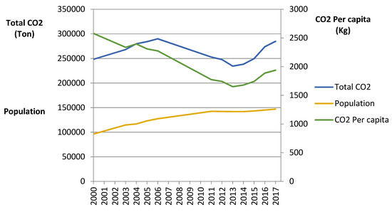 Figure 2, how the total emissions have the same trend as the fuel consumption (there is a stoichiometric ratio between fuel and carbon dioxide). The total emissions depend on the population and their consumption; in the graph we can observe how from 2000 to 2006 the growth in total emissions has been due to the population increase, but in this period per capita emissions have also been decreasing. From 2006 to 2017 there is a parallel trend in total emissions and per capita emissions. This phenomenon shows the importance of policies to improve the environmental efficiency in the economic model of Lanzarote Island.