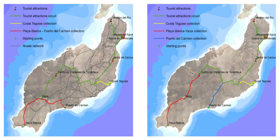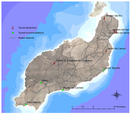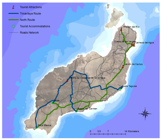 16] for Lanzarote in 2014, the distribution of the tourists according to their places of residence are 25.8% in Costa Teguise, 14.53% in Playa Blanca, 36.4% in Puerto del Carmen, and 19.37% in Yaiza. Two routes have been proposed in order to calculate the journeys that the tourists made to arrive at the different attractions. Firstly, we have considered the Timanfaya Route, which is marked in blue in