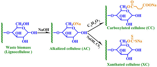 - Wang, C.; Wang, H.; Gu, G. Ultrasound-assisted xanthation of cellulose from lignocellulosic biomass optimized by response surface methodology for Pb(II) sorption. Carbohydr. Polym. 2018, 182, 21–28. [Google Scholar] [CrossRef] [PubMed]