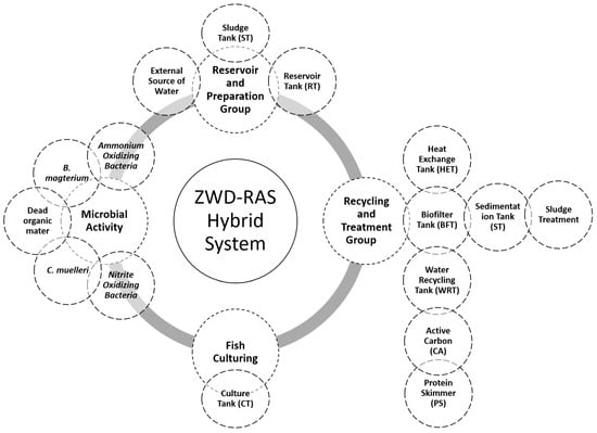 Scheme of the proposed hybrid ZWD–RAS system showing the components of each compartment in the proposed system.