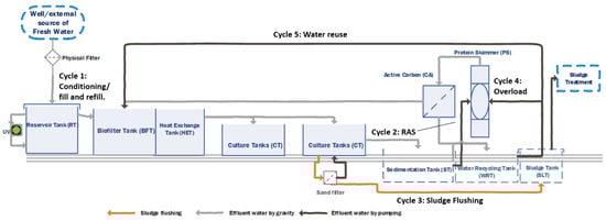 The hydraulic system is illustrated in Figure 2. It is composed of: (1) Physical filter to clean the water from particles coming from the source of water; (2) UV light for the disinfection of the water before entering the system; (3) Pipe network to connect the different kinds of basins and filters; (4) Sand filter to trap the sludge particles and send it to the sludge basin; (5) Two pumps, to pump the water from sedimentation basin and water recycling basin to the protein skimmer and biofilter basin; (6) Heat exchanger to heat the water to the optimum degree before it goes to the culture basins.
