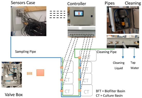 Figure 3 shows the architecture of the monitoring system. It is composed of three components. The first component is aimed at monitoring the vital water parameters. The second component concerns monitoring the water sampling inlets from the sampling water pipes connected to different basins (controlled independently by valve boxes at each basin). The third component corresponds to the pipes’ cleaning case. It includes an outlet of cleaning liquid (citric acid) and tap water connected to the sampling pipes. The role of the pipes’ cleaning is to ensure the accuracy of each new sample, so cleaning liquid and tap water are flushed through the sampling pipe after each water sample is taken. This takes place in each pipe; the system is automated to clean the pipe’s valve so that no tap water or cleaning fluid is let into the culture basins. The sensors’ case also holds a separate cleaning mechanism, which flushes the sensors with fresh water and recalibrates them. The specific sensors used are not listed in order to not cause unwanted replication of the monitoring system sold by Novaton.