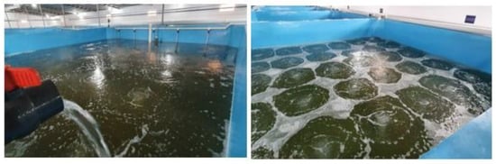 In the ZWD system, the water quality is maintained through microbial activity, including (i) Bacillus megaterium to enhance the rate of ammonification from accumulated organic matter; (ii) nitrification bacteria to convert toxic ammonia into less toxic nitrate; and (iii) the microalgae Chaetoceros muelleri to uptake nitrate, improve the dissolved oxygen (DO) level, provide shading, and act as a source of live feed for shrimp culture. However, even though the operational cost to maintain water quality in a ZWD system is relatively low, the system’s capacity is insufficient to support a long period of super-intensive shrimp/fish culture []. Therefore, there is a need for a hybrid farm system that combines the advantages of both the RAS and the ZWD system.