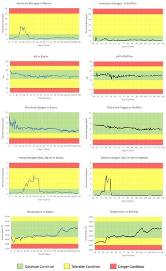 Figure 5 shows the water quality parameters as measured in the culture basins and the biofilter basin. The green area refers to the optimum range, while the yellow site refers to the tolerance range. The red area indicates the danger range. It could be observed that the totality of the water quality parameters was at the optimal level during the shrimp culture. However, an increase in ammonia, NH3, and nitrite, NO2, is observed on the 22nd day. This increase was used as a signal for the recycling treatment because the ZWD system could not ensure the water treatment without the recycling system’s assistance. Another increase in nitrite, NO2, was observed on the 48th day in the biofilter basin. This is due to the dissolving of settled particles in the pipes in the absence of water flow. This problem has been solved by reducing the pipe diameter and increasing the percent of the nitrifying bacteria in the water, as advised by Suantika et al. in [,,]. Despite these two issues, all water quality values remained in the tolerance range. After modifying the pipe’s diameter and the flow correction, the farm maintained the water quality in the optimal range.