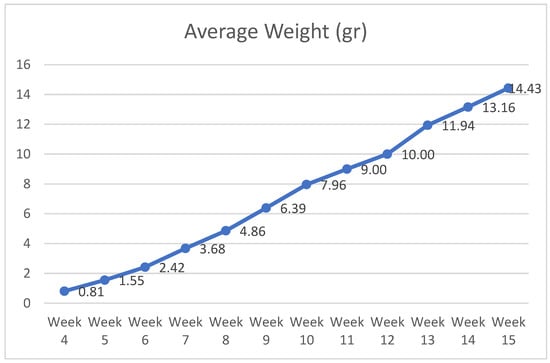 Statistical analysis showing the growth in Week 14 and Week 15 at 13.16 grams and 14.43 grams respectively.