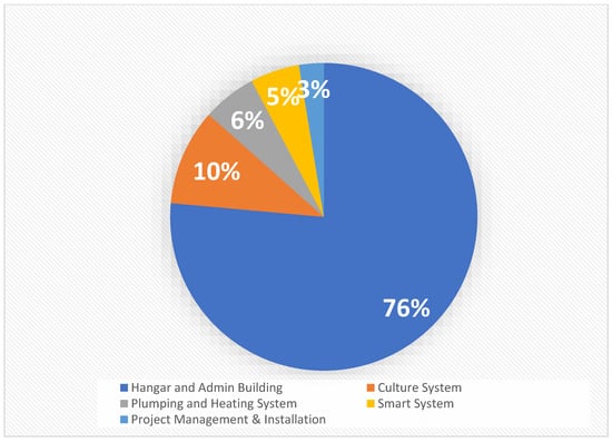 The initial cost of investment includes the following: (i) Hangar and Admin Building, (ii) Plumping and Heating System, (iii) Smart Systems, (iv) Culture System, and (v) Project Management and Installations. The percentage of each initial cost of investment is shown in the pie chart in Figure 10.