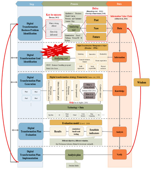 The literature on digital transformation lacks clear instructions and suggestions in terms of transformation architecture or decision steps. This study presents a decision framework for the digital transformation of the retail industry divided into five steps, as follows: (1) digital transformation business problem identification, (2) digital transformation goal identification, (3) digital transformation plan generation, (4) digital transformation plan evaluation, and (5) digital transformation plan implementation.