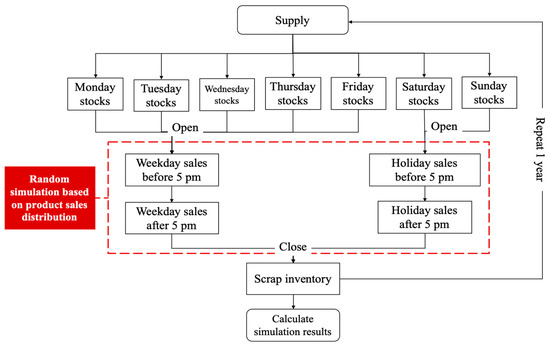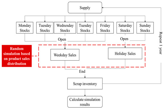 For many years, the SES model has been the default decision-making mode of CVS. The store operator is responsible for predicting and ordering fresh food commodities, and expired commodities are discarded after the due date. As the sales volume of CVS on weekdays and holidays differed markedly, sales volumes on weekdays and holidays were simulated for one year and the results combined to yield a result more congruent with reality. Figure 2 shows the simulation flowchart of the SES model.