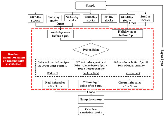 The situation conditions of the DPD model are those of dynamic promotion decision-making. Daily sales volume and inventory counts were carried out at 5 p.m. When the sales volume is less than 50% of the ordered quantity, the promotion signal displays a “red light”, indicating a high unsaleable risk (scrap), and a promotion ensues at a discount of 30%. When the sales volume is between 50% and 80% of the ordered quantity, the promotion signal displays a “yellow light”, indicating a mild unsaleable risk, and a promotion ensues at a discount of 20%. When the sales volume is more than 80% of the ordered volume and the promotion signal displays a “green light”, sales will continue at the original price. The simulation is divided into weekdays and holidays for a period of one year. The simulation process is illustrated in Figure 4.