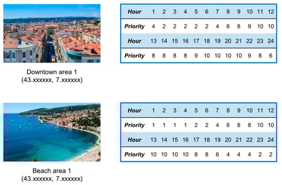 The flow of tourists’ movements at tourism destinations varies depending on the characteristics of the destination and time. For example, in beach destination, tourists will be crowded in the downtown area during mealtimes. However, in the afternoon, more tourists will visit the beach area, and the beach area will be less visited by tourists after dinner. In other words, the security priority of key locations will vary according to the characteristics and the time of the tourism destination. Therefore, the security system of tourism destination should be installed and operated to efficiently monitor key locations by considering their time-specific priorities using limited resources. Figure 1 shows the example of relative security priorities (maximum of 10) of downtown area and beach area in Nice, France over 24 h.
