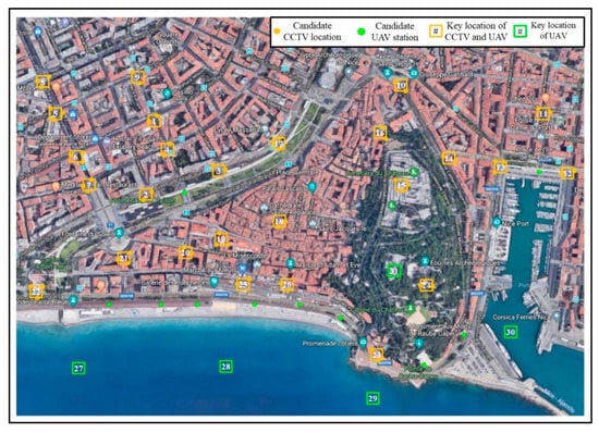 Nice, France was selected as the case study spot. The location of the key monitoring points has been set up as areas with a large floating population, such as tourist attractions and intersections. Nice is also a beach city, and many tourists enjoy the sea. Therefore, the coastal area was selected as having key points. In Figure 2, yellow and green boxes stand for such key locations. Yellow boxes are usually located at ground points while green boxes are located at coastal area and high land. This distinguishes the usability of CCTV and UAV. UAV has wider monitoring range that CCTV. Thus, it is able to monitor yellow and green key locations. However, CCTV is able to monitor only yellow key locations due to the limited range and installation limits. Consequently, monitoring yellow key points is available via both CCTV and UAV. However, green key locations can be monitored using only UAV. At the edge of yellow boxes, there are yellow spots, which indicate the candidate locations for CCTV installation. Due to the limited monitoring range or CCTV, CCTV should be installed around key locations. On the other hand, a UAV system requires the UAV station for replenishment of UAV consumables such as battery, camera, etc. Green spots in Figure 2 indicated the candidate locations for UAV stations.