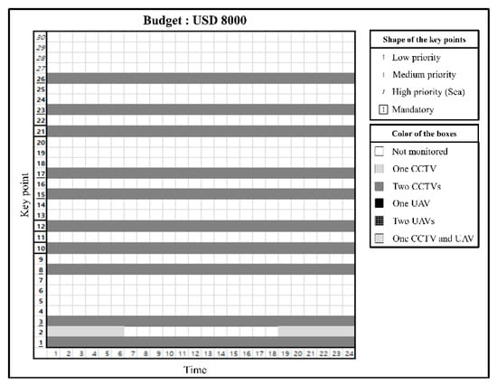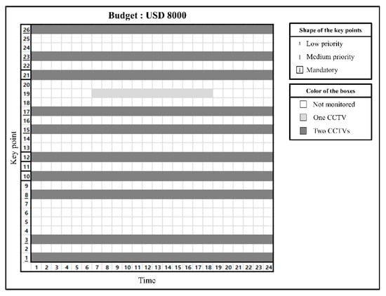 Using the parameters settings in Section 5.1.1, case study with situation 1 was conducted. The result of situation 1 with the USD 8000 budget was depicted Figure 3. Most key points are monitored by two CCTVs. With the budget of USD 8000, all the mandatory and medium priority key points are monitored. Therefore, with the current condition, USD 8000 is the minimum budget to guarantee the least security. In case of the low priority key points, key point 19 is monitored by one CCTV during the time between 7 o’clock to 18 o’clock. Therefore, it is derived that a total 21 CCTVs are needed to keep the least security. However, keeping the higher security can guarantee the safety of tourists. As the safety level gets higher, more tourists might prefer visiting the place, and it will lead to the true sustainability of tourism. Therefore, additional analysis with larger budgets is conducted. The run time of simulation 1 with USD 8000 budget was 08.13 s.
