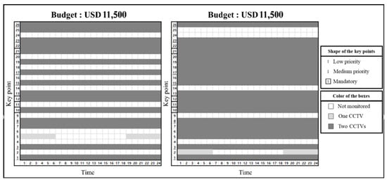 Figure 4 graphically shows the result of simulation (situation) 1 with USD 11,500 and 15,000 budgets. Obviously, the number of CCTVs increases when the budget becomes USD 11,500. Compared to the budget of USD 8000, key point 19 is fully monitored with two CCTVs. Most key points that are newly monitored by installing 2 CCTVs. In case of key point 5, they need 2 CCTVs to be monitored during 7 o’clock to 18 o’clock. Therefore, only one CCTV is installed.