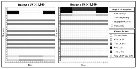 Limited budget does not allow monitoring of coastal and ground areas using UAVs. Therefore, additional analysis with increased budget is conducted, and the result is shown in Figure 6. When the budget increases, UAV is applied for coastal and the ground areas. When the budget is USD 11,500, coastal areas with high priority are monitored. Instead, some of the ground areas with medium priority are not monitored. By applying one UAV with increased budget to USD 15,000, it is founded that two coastal areas and one ground area are monitored. The number of ground areas that are monitored by two CCTVs can decrease. Consequently, it can be inferred that the slight increase of the budget can make it able to monitor a diverse area, but difficult to monitor all mandatory, high and medium priority areas. When the budget become USD 15,000, which is almost double compared to the original USD 8500 budget, monitored coastal areas increases. However, the number of ground areas that are monitored decreases. Such results are obtained within 06.78 and 09.01 s for USD 11,500 and 15,000 budget cases.