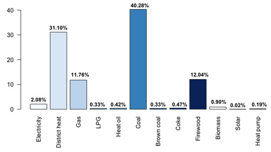 The description of categorical and continuous variables is presented in Figure A1 and Figure A2 on the Annex. Preliminary statistics show that the sample contains almost the same proportion of households living in detached houses and apartments, most built between 1961–1980. The most frequent are 50–100 m2 dwellings with 2–3 rooms. Per respondents’ estimation, homes are in good technical condition and are comfortable in winter and summer. Households from rural areas predominate in the sample (46.52%), most having dependent children. More than 40% of households reported good or rather good financial conditions. On average, households spent PLN 3889 (around EUR 850) on energy bills in 2018, constituting almost 7% of the average annual disposable income. Figure 1 shows the primary sources for homes’ space heating in Poland. Solid fuels have the largest share, amounting to more than 50% of all sources, with coal being the most demanded source (40.28%). District heating represents only one-third of all energies.