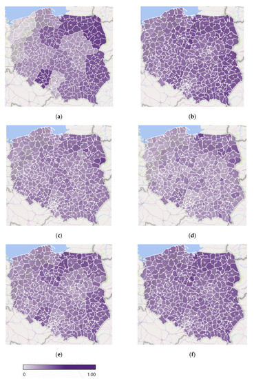 Geographical distribution of energy poverty in Poland, 2018: (a) hidden energy poverty per region; (b) energy poverty and PC1: degree of urbanization and building type; (c) energy poverty and PC2: elderly people in rural areas and respiratory diseases; (d) energy poverty and PC3: urbanized suburbs and small cities with poor air quality and low salaries; (e) energy poverty and PC4: inhabitants of populated areas in post-productive age earning a low income, relying on social assistance, and disparities in the economic development of some cities; and (f) energy poverty, PC1, PC2, PC3, and PC4: regional vulnerability to energy poverty. Note: all values are standardized to obtain the same range from 0 to 1.