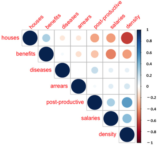 In the second step, we examine factors of vulnerability to energy poverty in 380 Polish districts following PCA, which seems appropriate, taking into account quite a large number of dimensions that our dataset has. To begin with, we look at the visualization of the correlation matrix (Figure 4). The graph presents the correlation between variables, sized from strongest to weakest, and reordered to mirror the direction and strength of a correlation. We notice a positive correlation between density and post-productive age, and a negative correlation between houses and density, salaries, and benefits recipients.