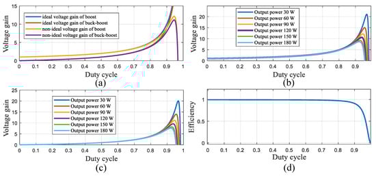 (a) The comparison of the ideal/non-ideal voltage gains of buck-boost and boost converters, (b) the non-ideal voltage gain of the boost converter for the different output powers, (c) the non-ideal voltage gain of the buck-boost converter for the different output powers, (d) the efficiency of the conventional converters.