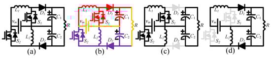 The first operation mode of the converter is started by activation of both switches. According to Figure 2c, the diodes are in their reverse biased. It is worth noting the inductors are magnetized due to their positive voltage as well as the capacitors are discharged due to their negative current. The inactivation of switches and the activation of the diodes start the second operation mode. The equivalent circuit of the converter in this mode has been illustrated in Figure 2d. The inductors’ voltage and capacitors’ current during both operation modes are (1):