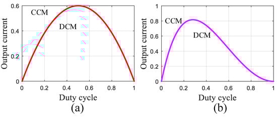 According to Figure 3a,b, the operation of the converter in CCM or DCM regions has been presented based on the value of the output current and duty cycle. It is worth noting that Figure 3a has been extracted for a constant output voltage as well as Figure 3b has been extracted for a constant input voltage.