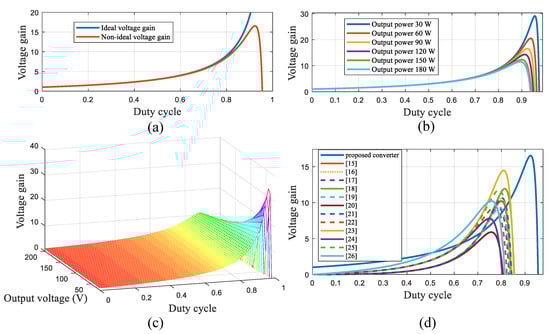 (a) The comparison of the ideal/non-ideal voltage gain of the proposed converter, (b) the non-ideal voltage gain of the proposed converter for the different output powers, (c) the behavior of the voltage gain while the duty cycle and output power are varying, (d) the comparison of the non-ideal voltage gain of the proposed converter and suggested converters of [15,16,17,18,19,20,21,22,23,24,25,26].