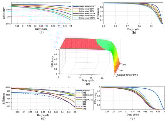 (a) The efficiency of the proposed converter for the different output powers while the duty cycle varies from 0 to 50, (b) the efficiency of the proposed converter for the different output powers while the duty cycle varies from 50 to 100, (c) the efficiency of the proposed converter while the duty cycle and output powers are varying, (d) the comparison of the efficiency among the proposed converter and converters of [15,16,17,18,19,20,21,22,23,24,25,26] while the duty cycle varies from 0 to 50 percent, (e) the comparison of the efficiency among the proposed converter and converters of [15,16,17,18,19,20,21,22,23,24,25,26] while the duty cycle varies from 50 to 100 percent.