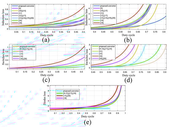 In Figure 6e, the diode loss of the proposed converter has been compared with the proposed converters of [15,16,17,18,19,20,21,22,23,24,25,26]. As can be understood, while the duty cycle varies from 0 to 50 percent, the diode loss of the proposed converter is lower than the mentioned converter of [24] and while the duty cycle varies from 50 percent to 80 percent, the diode loss of the proposed converter is lower than the mentioned converters of [15,16,17,18,19,20,21,22,23,24,25,26].