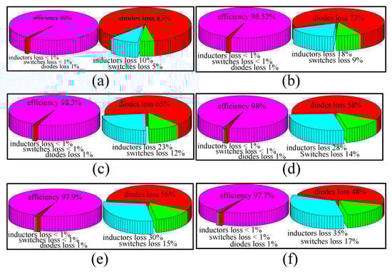 In Figure 7a–f, the percentage of the efficiency and the different kinds of loss have been illustrated for the output power of 30 W, 60 W, 90 W, 120 W, 150 W, and 180 W. It is worth noting the percentage of the duty cycle is 50 percent. As can be understood, the major loss is diode loss. Moreover, an increase in the output power leads to an increase in the inductor loss to more than twice the switching loss. Furthermore, an increase of output power to more than 150 W concludes the higher value of the summation of the inductor and switch loss in comparison with the diode loss. It is worth noting that in all the mentioned output powers, the efficiency is more than 97 percent.