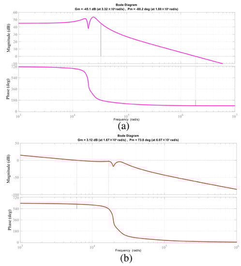 Based on the matrices, the bode diagram of the proposed converter has been extracted and the phase and gain margin have been extracted −45.1 dB and −88.7 deg respectively. The bode diagram has been illustrated in Figure 8a. Based on the expressed space state equations, the compensator of the mentioned system has been calculated as below by MatLab.