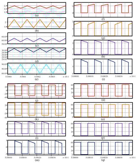 The simulation results of the proposed converter: (a) the first inductor current, (b) the second inductor current, (c) the first capacitor voltage, (d) the second capacitor voltage, (e) the output capacitor voltage, (f) the first switch current, (g) the second switch current, (h) the first diode current, (i) the second diode current, (j) the first inductor voltage, (k) the second inductor voltage, (l) the first capacitor current, (m) the second capacitor current, (n) the first switch voltage, (o) the second switch voltage, (p) the first diode voltage, (q) the second diode voltage.