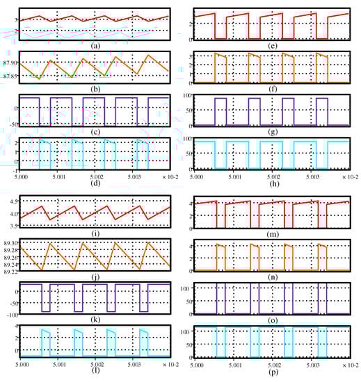The simulation results of the boost converter: (a) the first inductor current, (b) the output voltage, (c) the inductor’s voltage, (d) the capacitor’s current, (e) the switch current, (f) the diode current, (g) the switch voltage, (h) the diode voltage, and the simulation results of the buck-boost converter (i) the first inductor current, (j) the output voltage, (k) the inductor voltage, (l) the capacitor’s current, (m) the switch current, (n) the diode current, (o) the switch voltage, (p) the diode voltage.