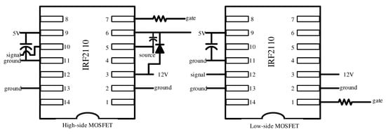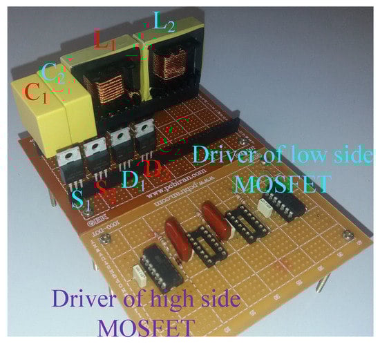 A comparison between (21) and (19) defines their compatibility. Therefore, the validity of the expressed relations of (2) and (4) is improved. In Figure 9f–i, the current waveforms of the switches and diodes have been illustrated. According to these figures, the average current of the semiconductors is 1 A. Moreover, it can be understood that the switches and diodes operate asynchronously as well as stated in the second section. According to (1), the applied voltage to the inductors is 30 V and −30 V in the first and second modes respectively. It is worth noting that these values are compatible with Figure 9j,k. Moreover, in the first mode, the crossing current from the capacitors is . Furthermore, in the second mode crosses the capacitors. It is worth noting that the current waveforms of Figure 9l,m are compatible with the mentioned concepts. It is also worth noting that the applied voltage to the semiconductors during their inactivation mode is compatible with the extracted equations in (3). In Figure 10, the boost and buck-boost converters have been simulated to increase 30 V input source to 90 V output. It is worth noting that 66 percent and 75 percent duty cycles cause the voltage gain of three in the boost and buck-boost converters respectively. The presented results in Figure 10a–h are for the boost converter and the remaining is for the buck-boost one. In comparison with the proposed converter, the boost and buck-boost converters require a higher duty cycle to have a three times voltage gain. Moreover, according to Figure 10g,h,o,p the semiconductors experience higher voltage during their inactivation mode. Furthermore, based on Figure 10e,f,m,n the semiconductors experience higher current during their activation. Consequently, the proposed converter provides the mentioned voltage gain with a lower duty cycle and semiconductors’ current/voltage stresses. In Figure 11, the details of the used drivers have been presented. Moreover, IRF540 and 2015OCT are the types of MOSFETs and diodes used. Furthermore, all the used capacitors are MKT capacitors with a low equivalent series resistance (ESR). In Figure 12, the experimental results of the proposed converter have been illustrated. Based on the expressed values of the inductors and capacitors in (20), the voltage waveforms of the capacitors and current waveforms of the inductors have been illustrated. In addition, their average values have been expressed in (21):