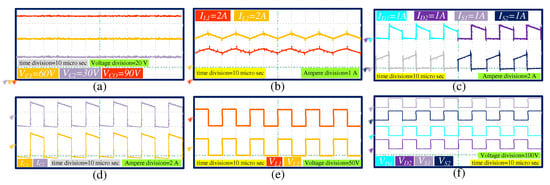 Experimental results: (a) the capacitor’s voltage, (b) the inductor’s current, (c) the semiconductor’s current, (d) the capacitor’s current, (e) the inductor’s voltage, (f) the semiconductor’s voltage.